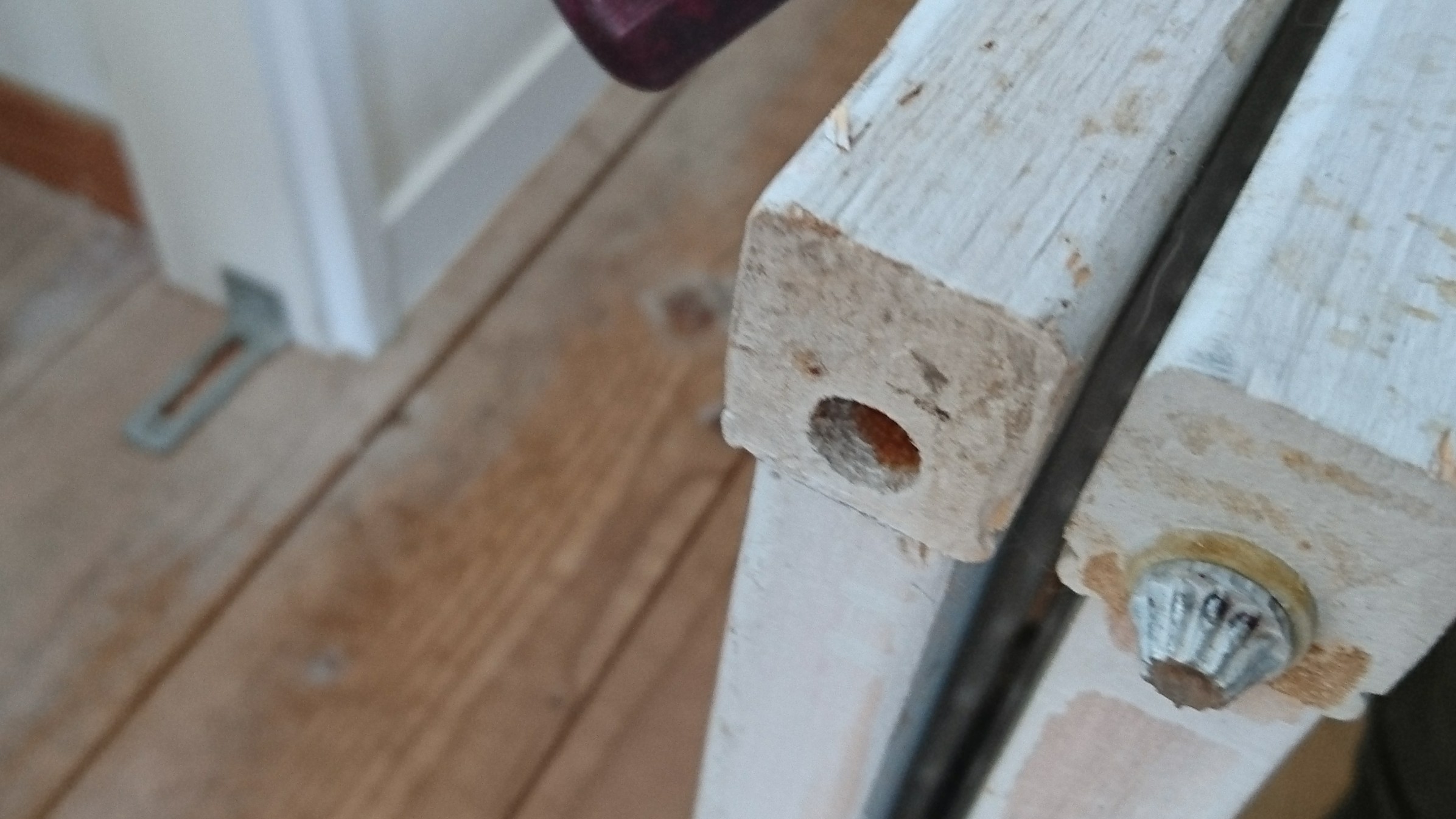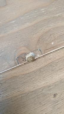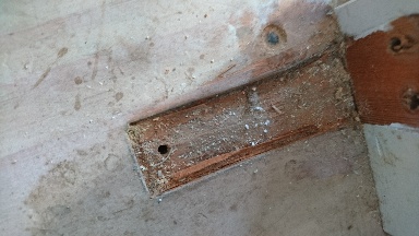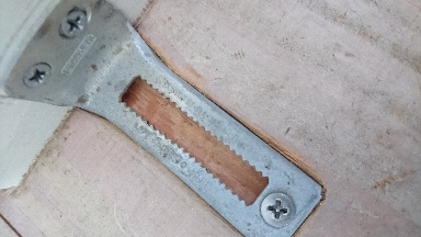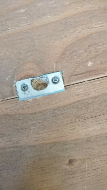 やっちまった。金具を埋める部分も掘っておかないと床より盛り上がってしまうんだったことに穴をあけてから気づく。