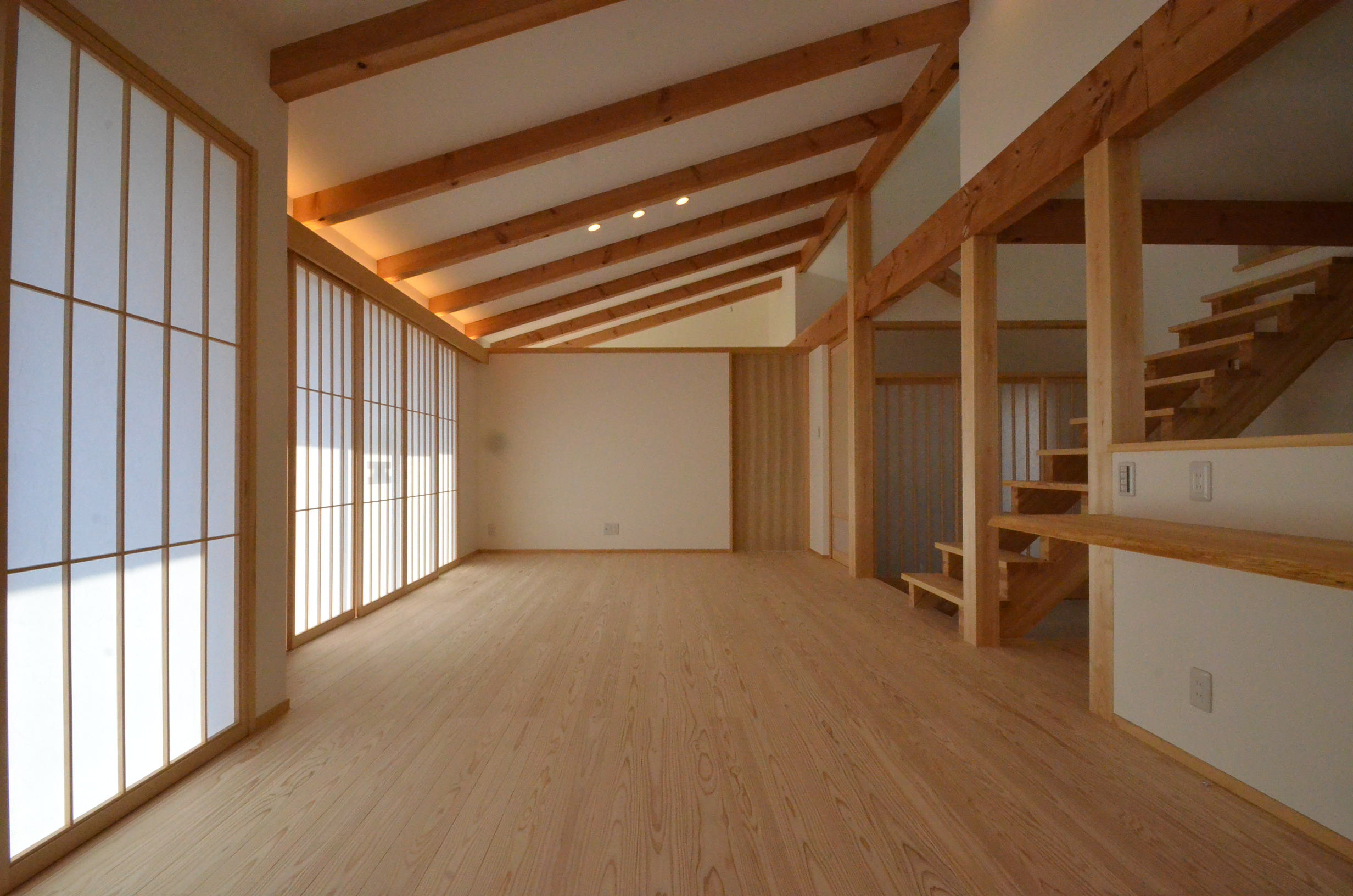 西粟倉村産の杉床材、繊細な和のデザイン、家族がひとつに繋がる大空間を